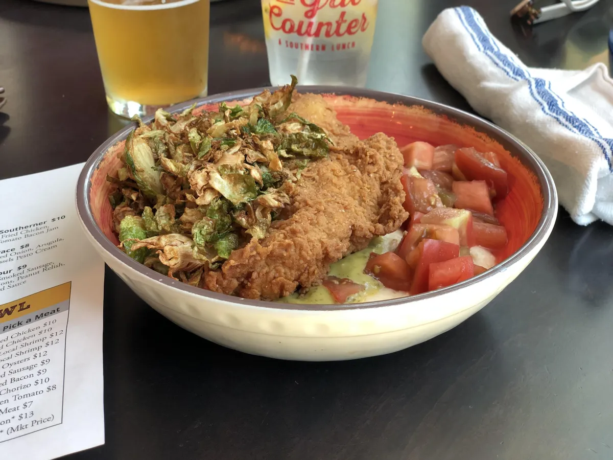 There we were, sitting with Mama Cindy and Daddy Hank over bowls of gouda-laced grits, stacked with crispy fried chicken, generously smothered with heirloom tomatoes, fried brussels, and served with Grace!